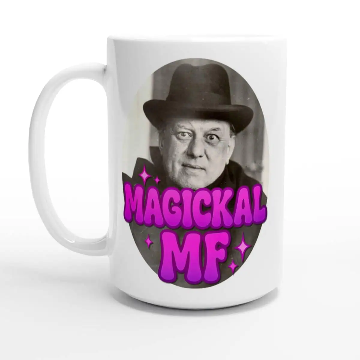 Start your day with a little chaos and a lot of caffeine. The Magickal MF 15oz Ceramic Mug features a vivid print of occult icon Aleister Crowley paired with punchy MAGICKAL MF bubble text — perfect for witches, wizards, and the magically inclined who like their coffee hot and their vibes hotter.