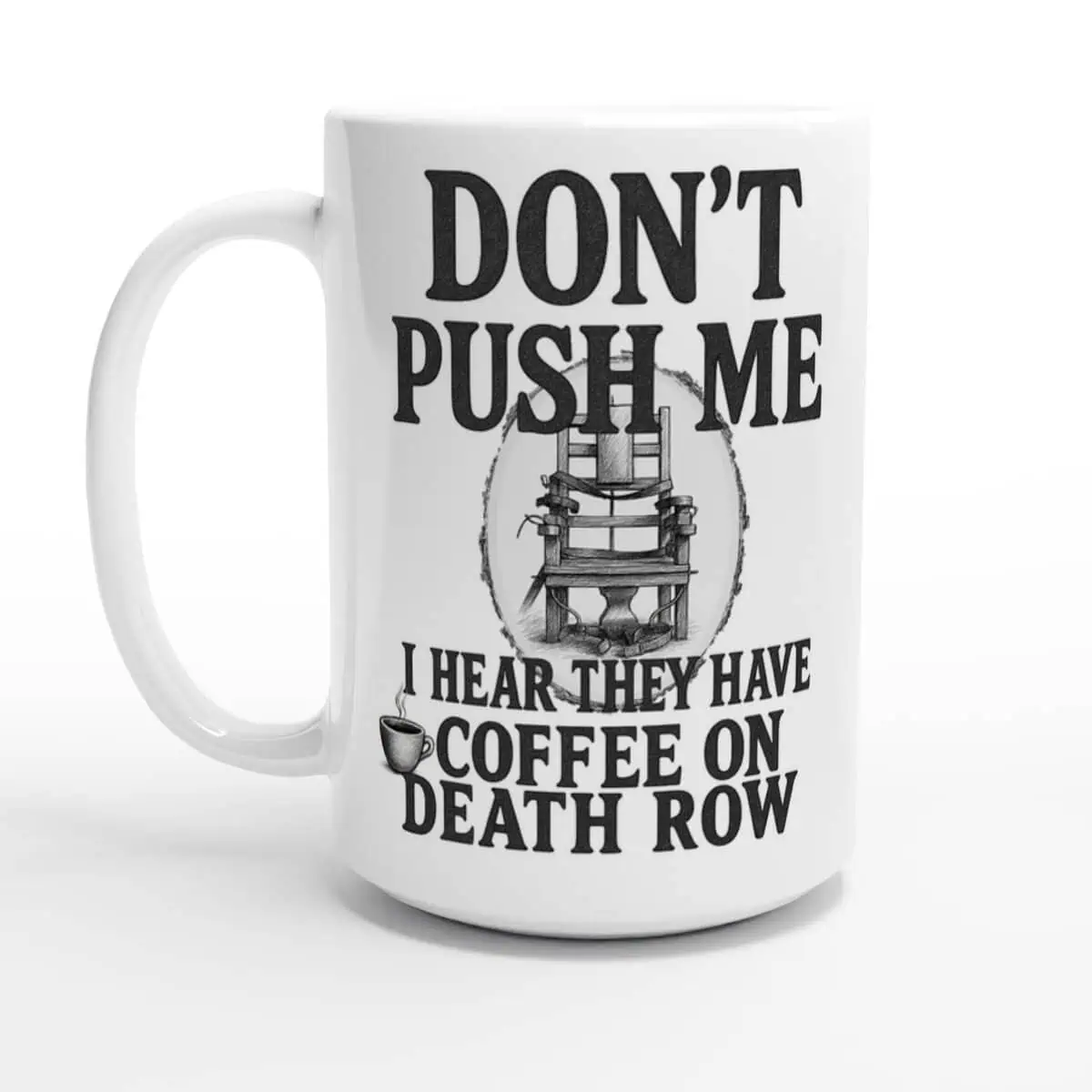 Start your day with a dose of dark humor. This bold 15oz ceramic mug features a vintage-style electric chair illustration and the phrase: