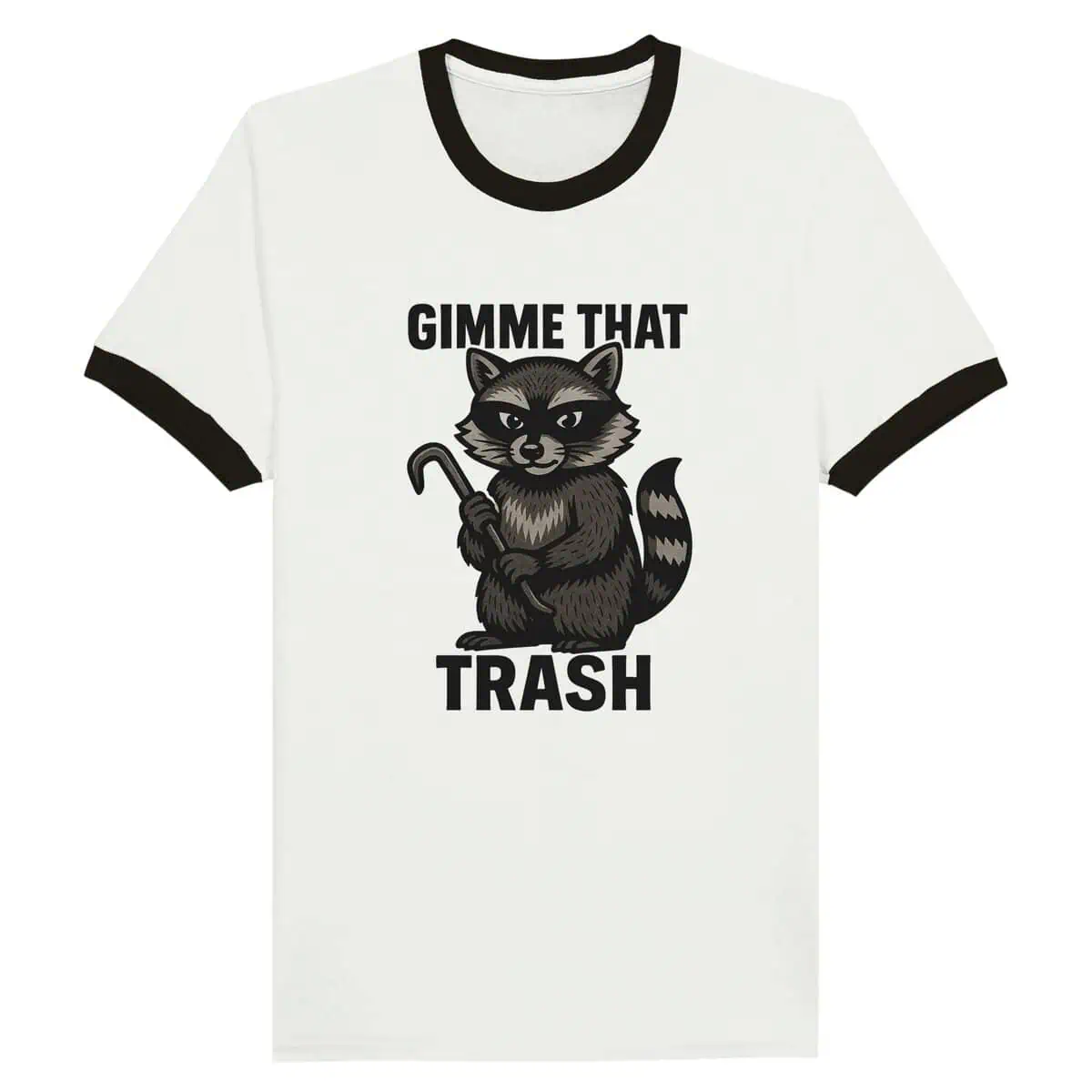 This retro-style ringer tee gives our favorite chaotic raccoon a whole new vibe. With contrasting sleeves and neck, it’s the perfect combo of cute, creepy, and slightly criminal. Whether you’re into true crime humor or just love a trash panda with a crowbar, this shirt makes a loud statement without saying a word.
