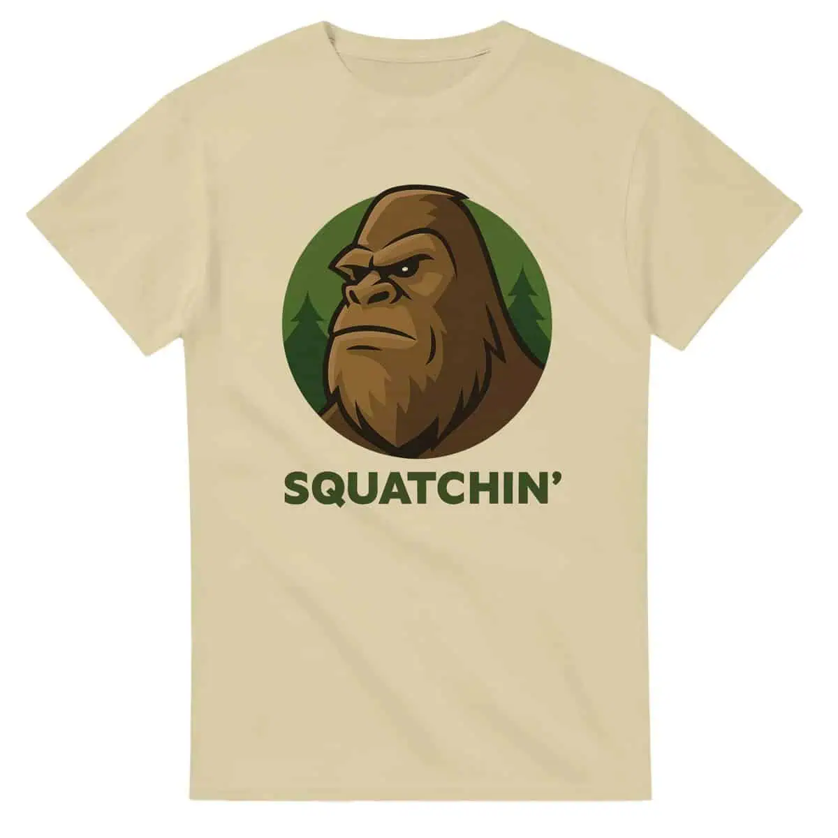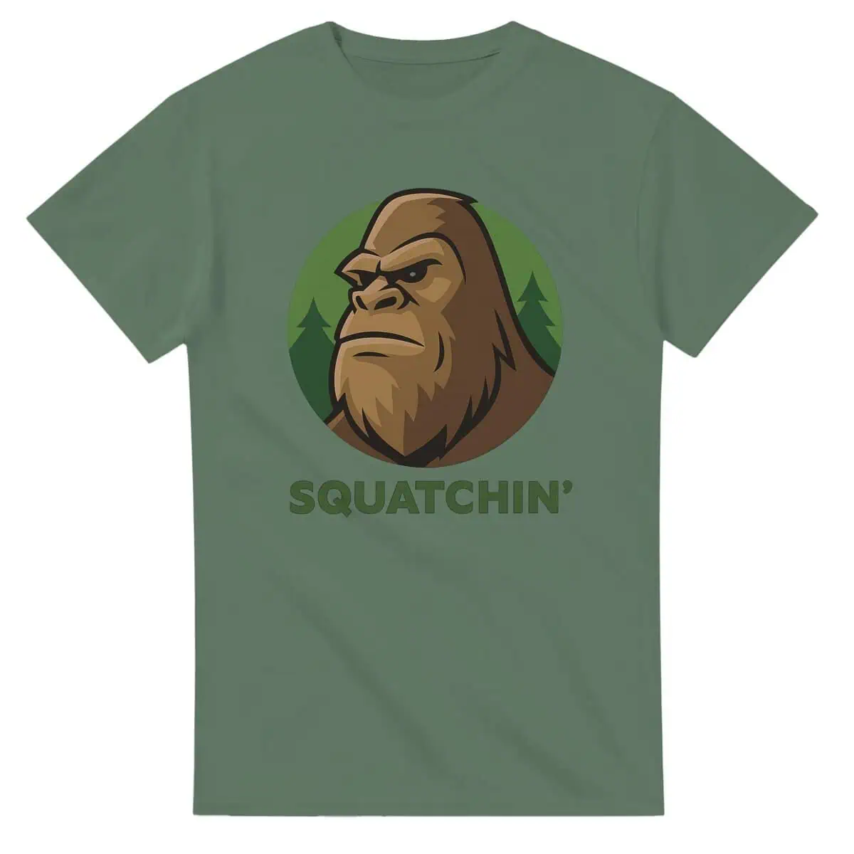 This heavyweight Bigfoot tee is a classic — built for trail hikes, late-night cryptid talks, or sipping coffee by the fire while waiting for something weird to walk by. The bold cartoon-style design features a chill Sasquatch in shades, backed by a green forest circle and the word “Squatchin’” loud and proud.