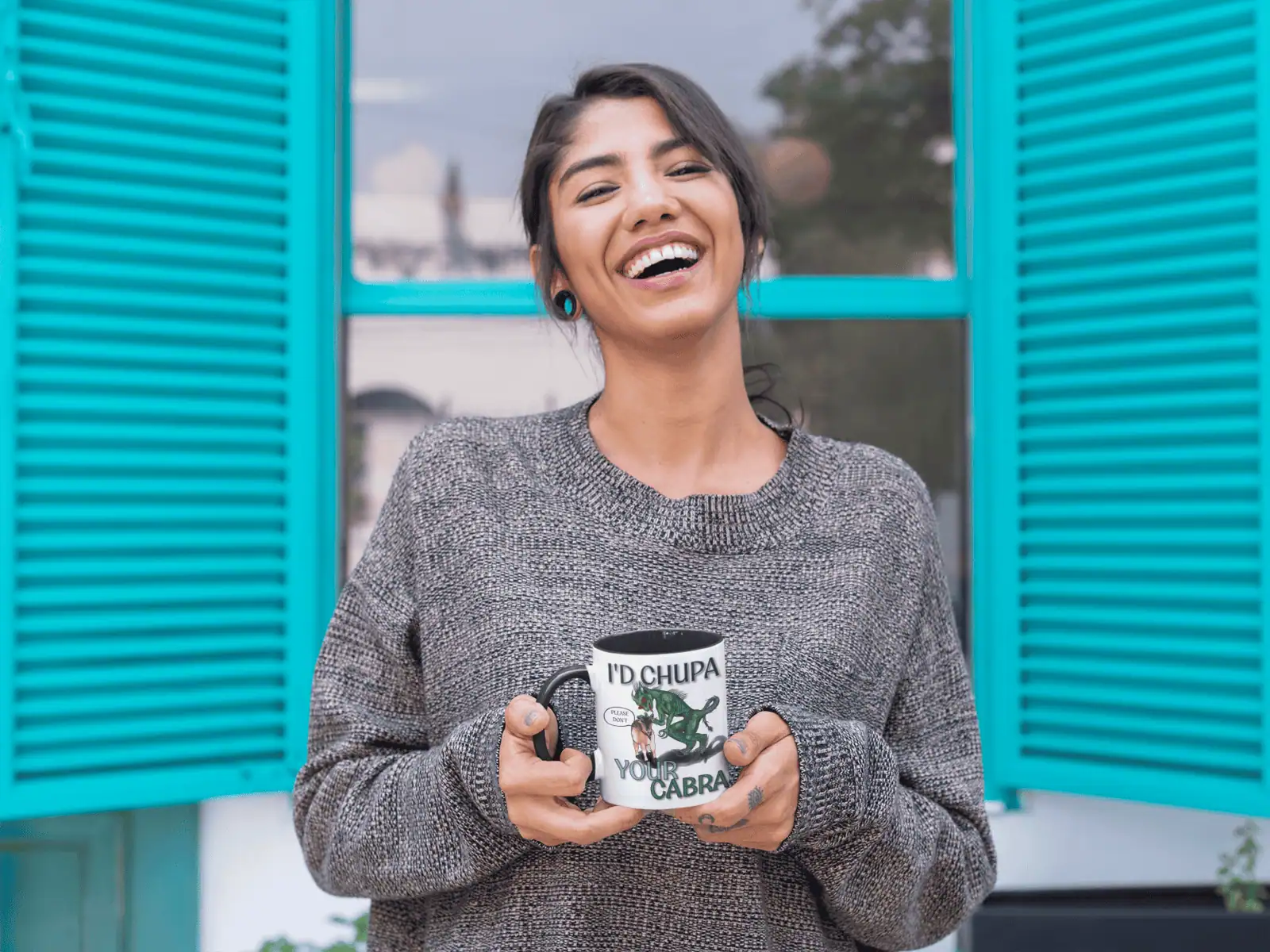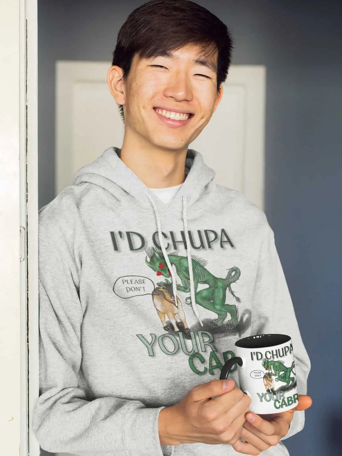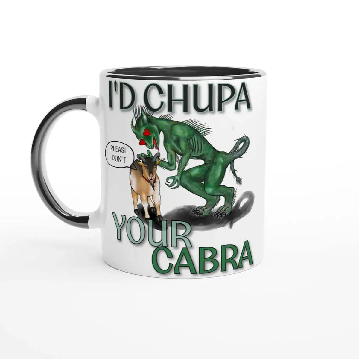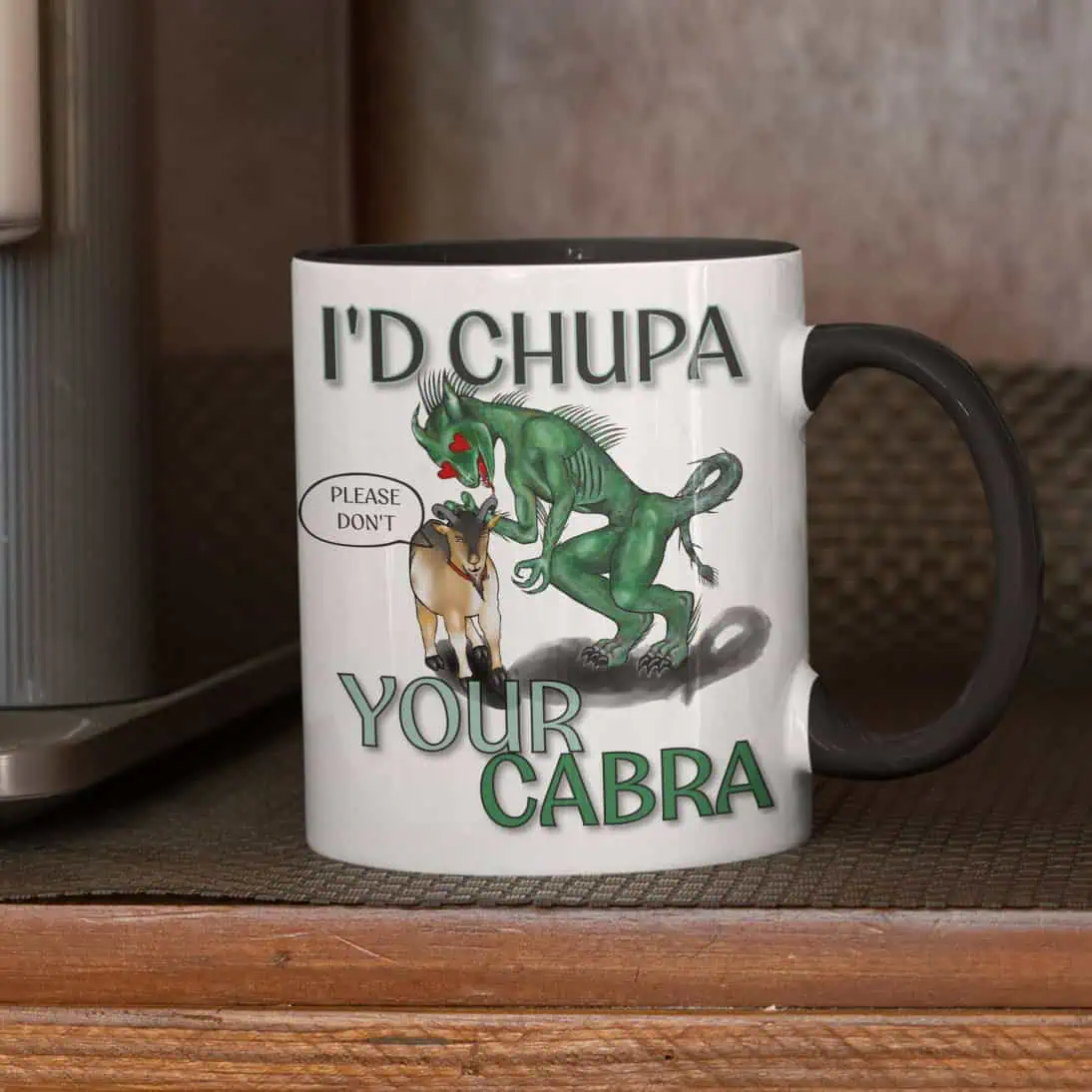 Our 11oz I’d Chupa Your Cabra mug features a lovesick chupacabra with heart eyes and a… um… suggestive pose. This mug takes paranormal humor to inappropriate lows. Whether you’re into cryptids, dark jokes, or both — this one’s for the believers with benefits.
