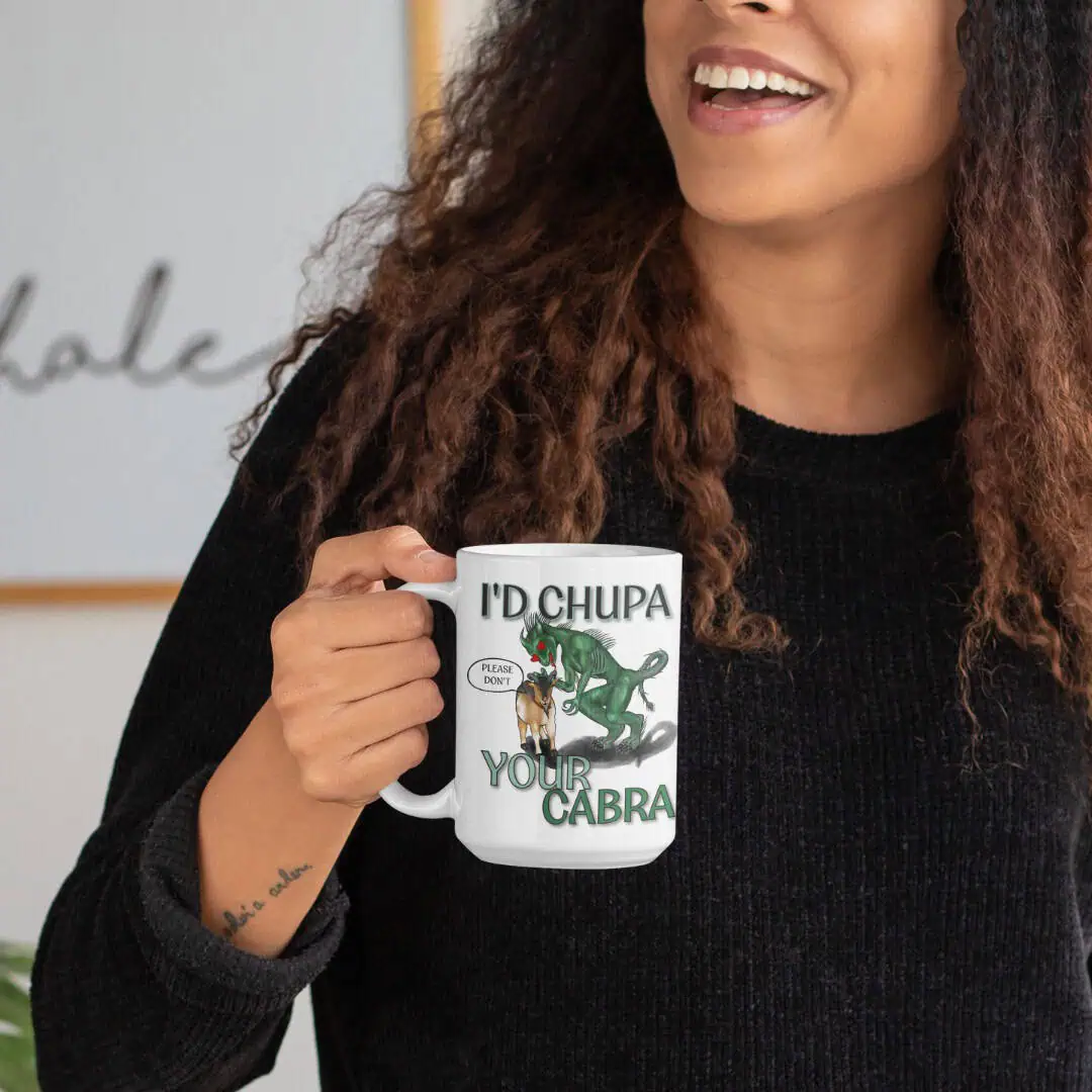 Our 15oz I’d Chupa Your Cabra mug features a lovesick chupacabra with heart eyes and a… um… suggestive pose. This mug takes paranormal humor to inappropriate lows. Whether you’re into cryptids, dark jokes, or both — this one’s for the believers with benefits.