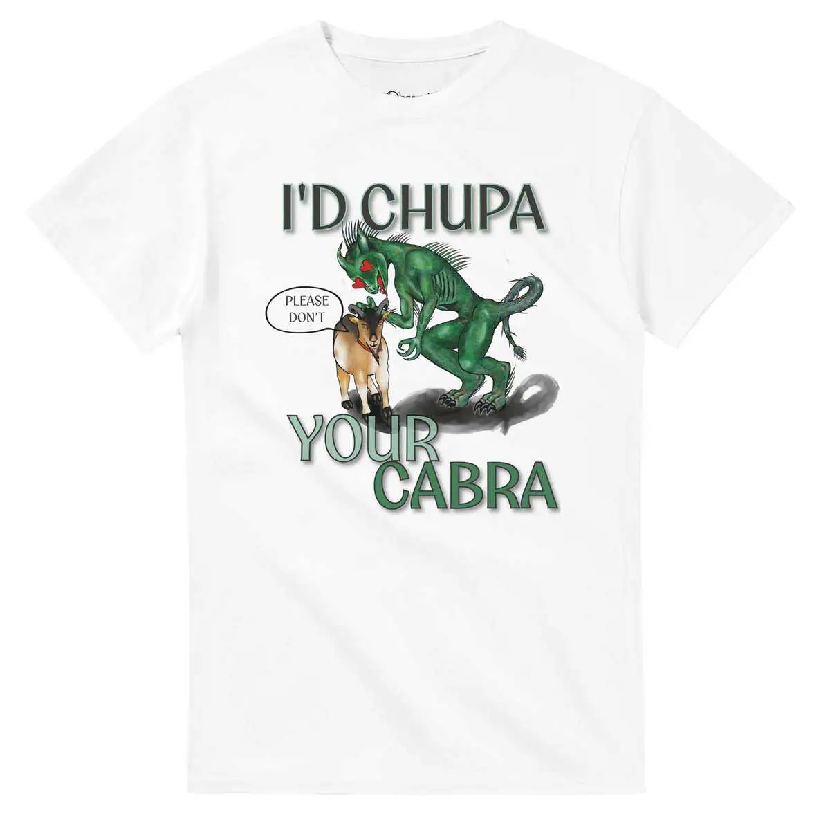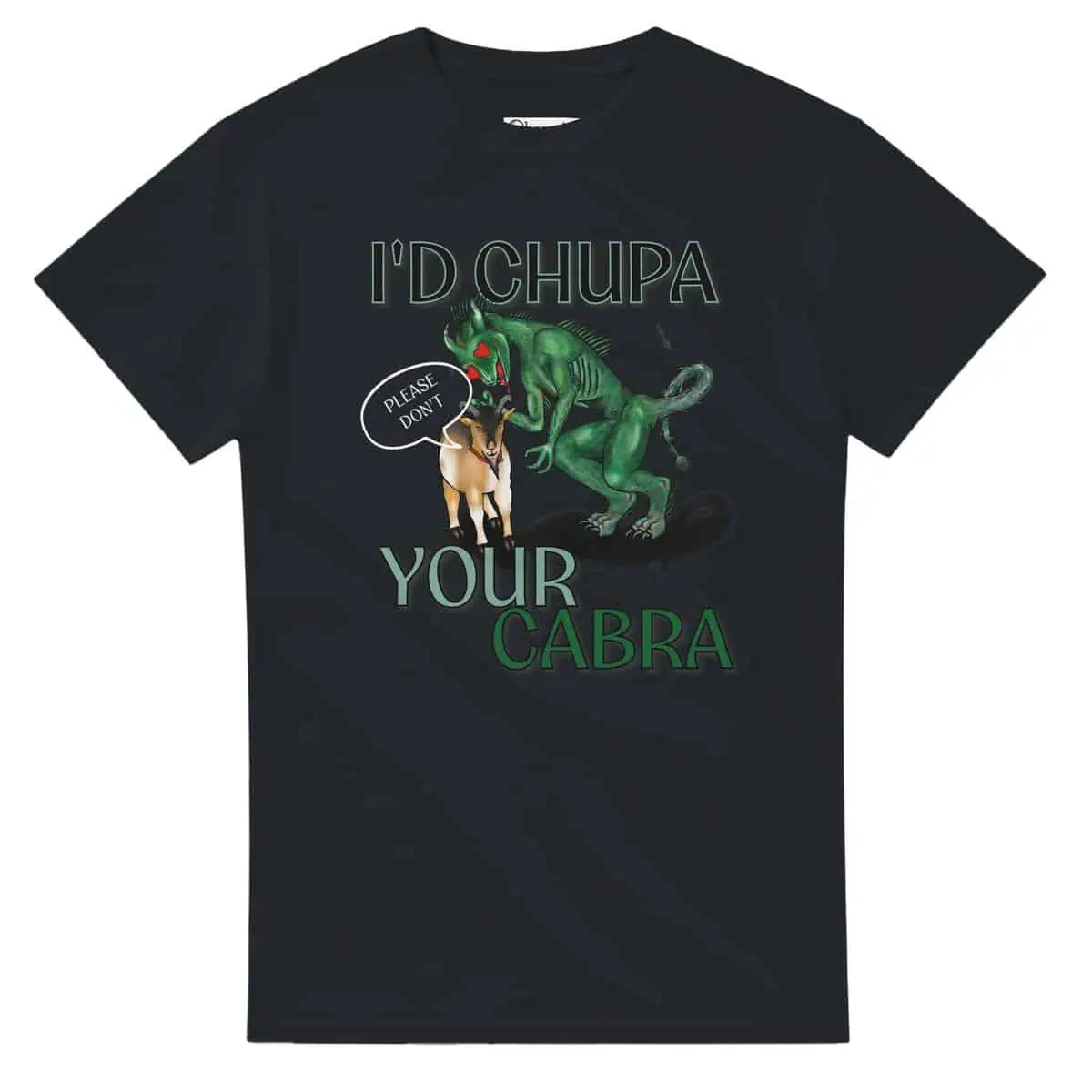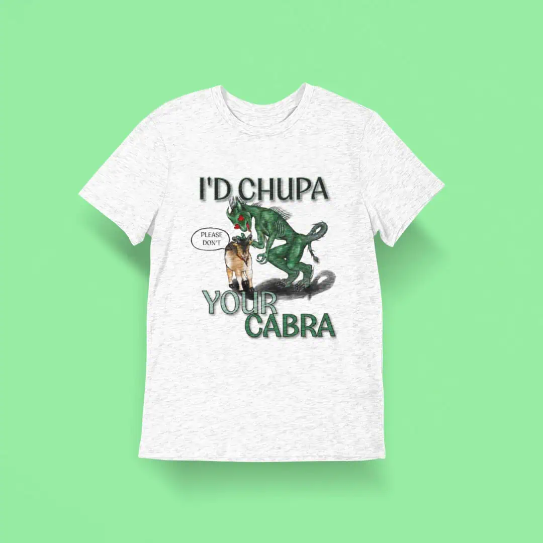 This design features a wide-eyed chupacabra, hopelessly desiring its goat companion, under the phrase “I’d Chupa Your Cabra.” Illustrated in full color with a blend of mischief and monster love, it’s perfect for the romantically ridiculous and the cryptid-curious.