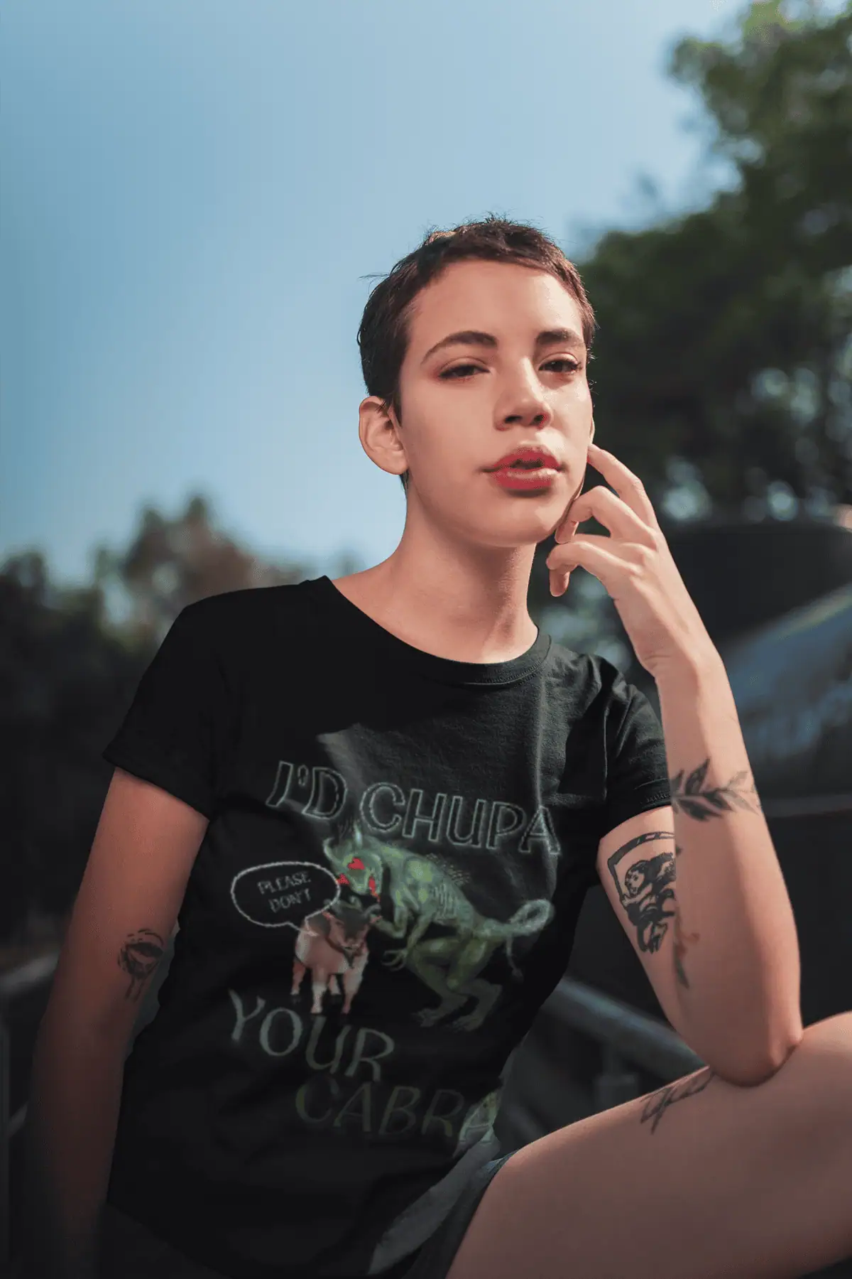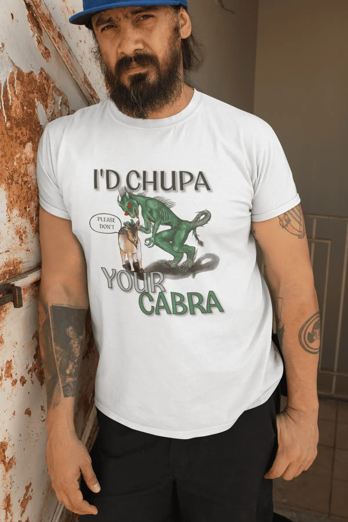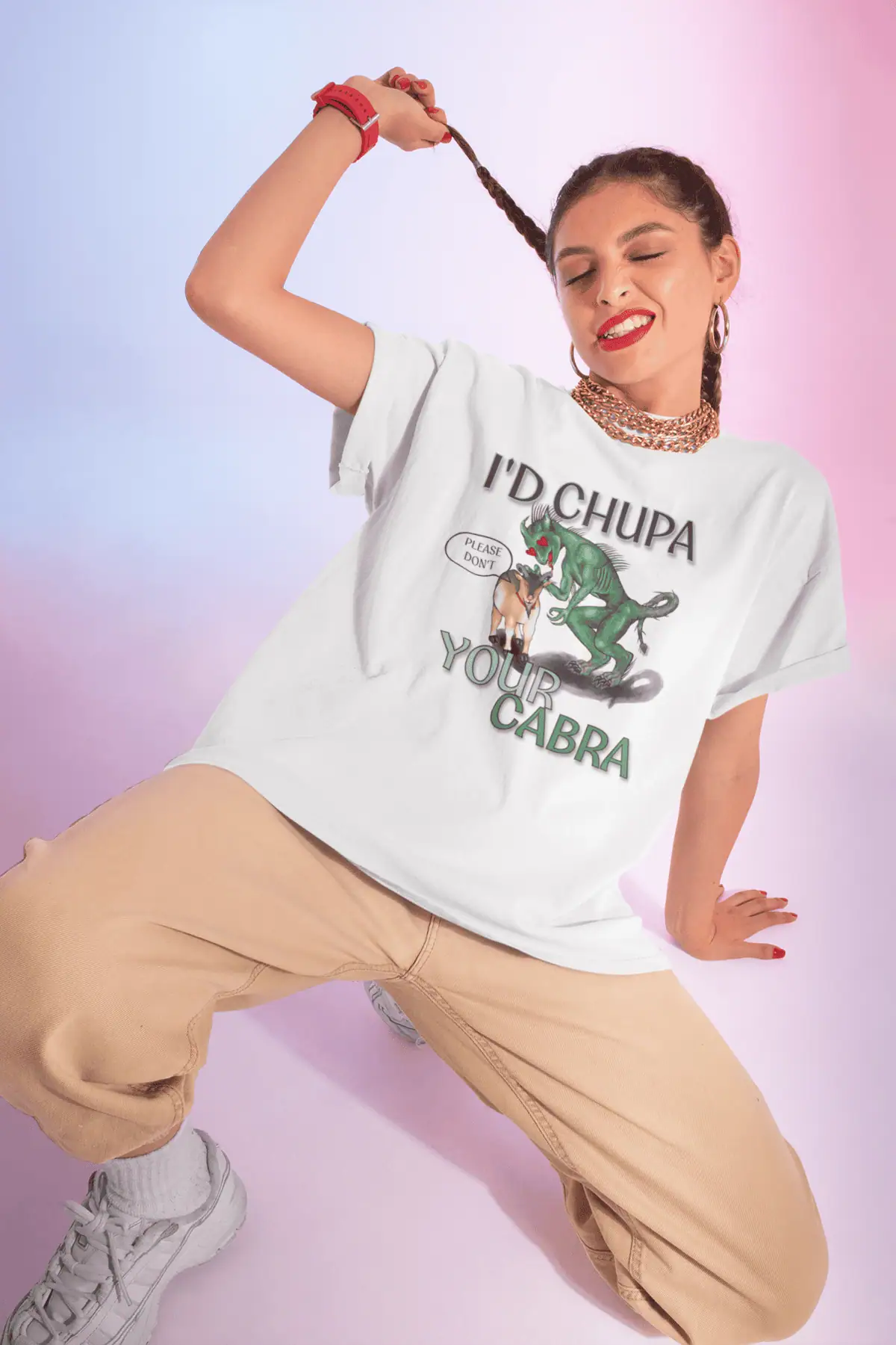 This design features a wide-eyed chupacabra, hopelessly desiring its goat companion, under the phrase “I’d Chupa Your Cabra.” Illustrated in full color with a blend of mischief and monster love, it’s perfect for the romantically ridiculous and the cryptid-curious.