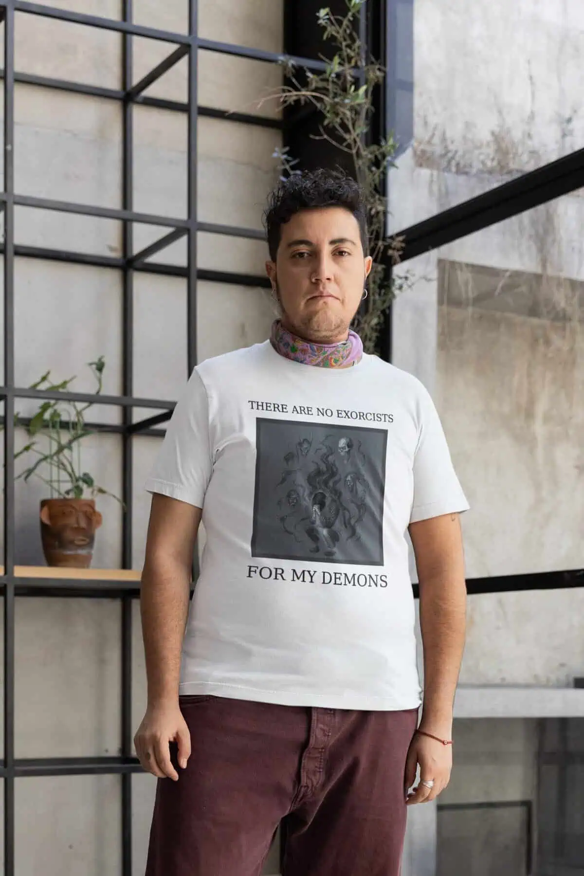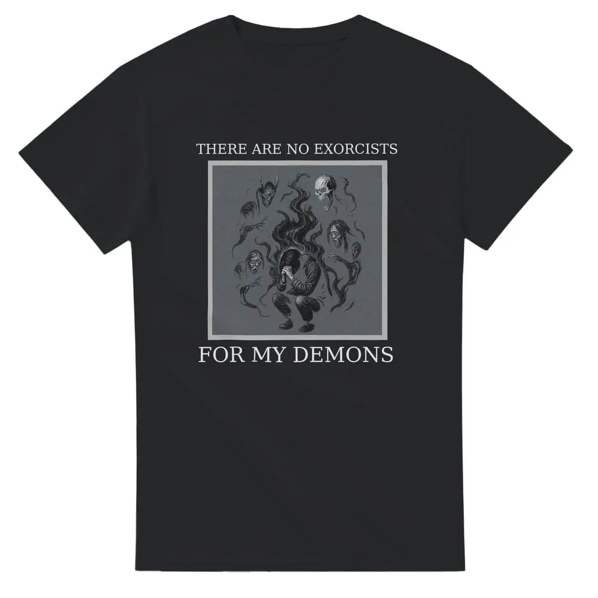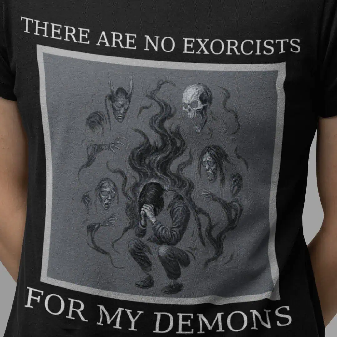 Featuring a slouched, haunted figure and ghostlike forms rising like smoke, the No Exorcists For My Demons design reminds us that not all battles can be banished so easily. Some of our struggles take a little more, and others, we just have to live with.