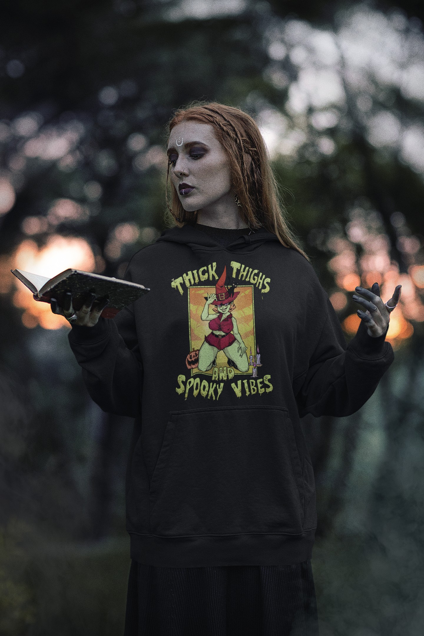 Front and center is a bold cartoon witch, serving “don’t f*** with me” energy, framed by pumpkins, candles, and a splash of haunted-season flair. The phrase “Thick Thighs and Spooky Vibes” celebrates confidence, body positivity, and Halloween spirit in one wickedly fun design.