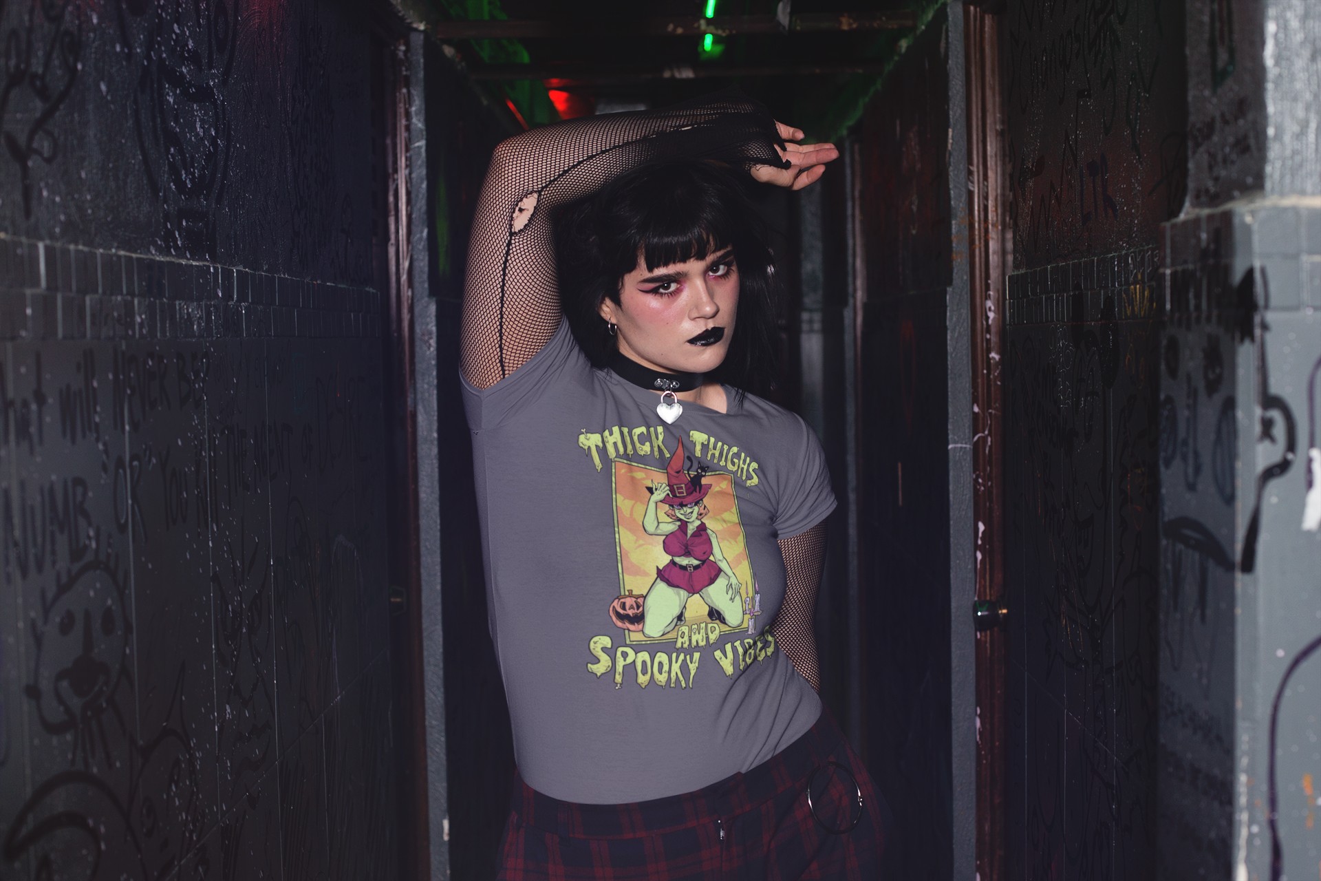 Whether you’re carving pumpkins, hitting haunted houses, or celebrating spooky season every season, this women’s tee sets the mood and shapes the curves.